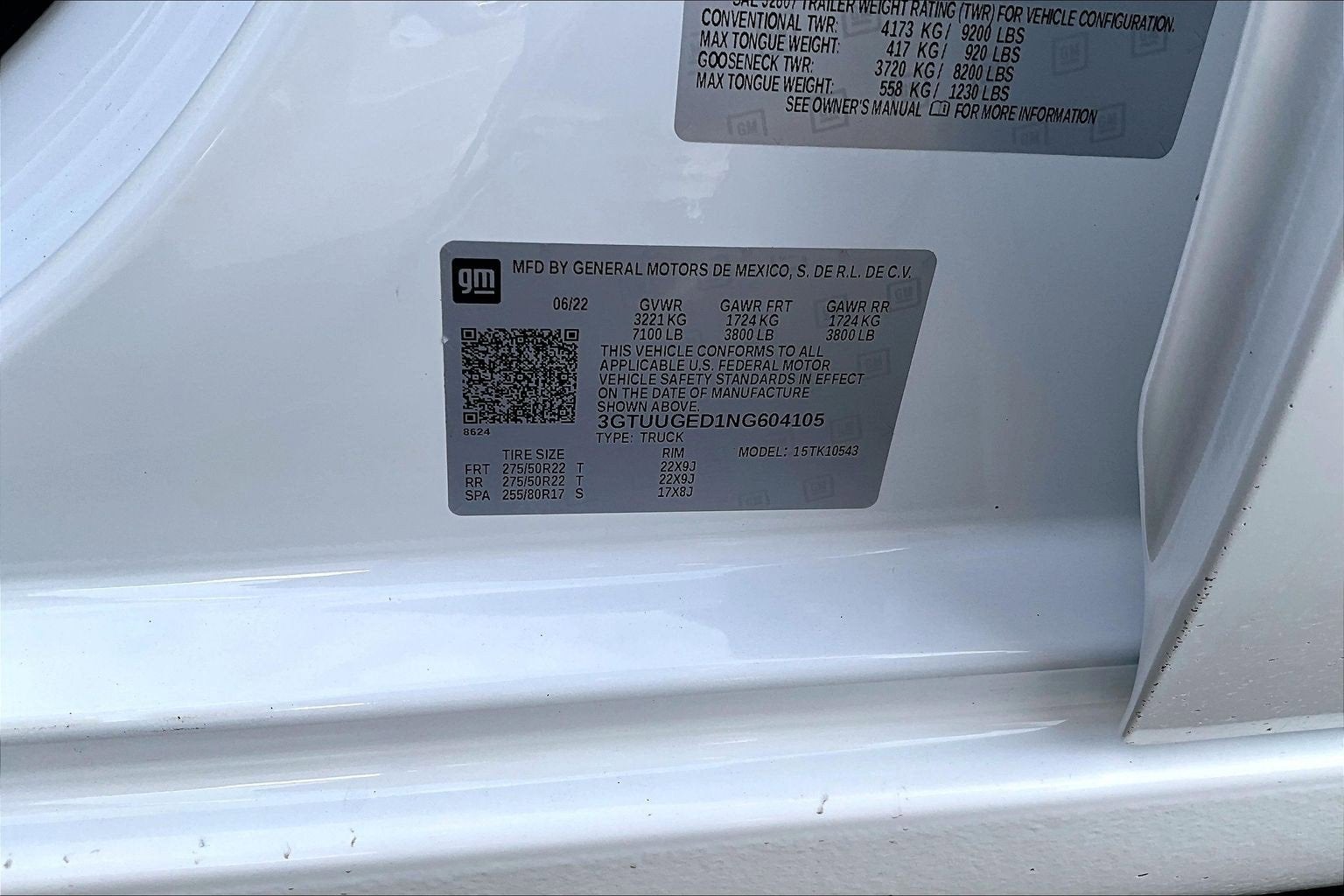 10-Speed Automatic, 4WD, Atmosphere/Brownstone Leather, 10-Way Power Driver Seat Adjuster w/Lumbar, 10-Way Power Passenger Seat Adjuster w/Lumbar, 120-Volt Bed Mounted Power Outlet, 120-Volt Instrument Panel Power Outlet, 170 Amp Alternator, 2 Charge/Data USB Ports Inside Center Console, 2 Type-C Charge-Only Rear USB Ports, 2 USB Ports, 3 Years of OnStar Safety & Security, 3.23 Rear Axle Ratio, 4-Wheel Disc Brakes, 7 Speakers, ABS brakes, Adaptive Cruise Control, Adaptive suspension, Air Conditioning, Alloy wheels, AM/FM radio: SiriusXM with 360L, Apple CarPlay/Android Auto, Auto High-beam Headlights, Auto-dimming door mirrors, Auto-dimming Rear-View mirror, Auto-Locking Rear Differential, Automatic Emergency Braking, Automatic temperature control, Auxiliary External Transmission Oil Cooler, Bed View Camera, Body Color Wheel Arch Moldings (LPO), Brake assist, Buckle to Drive, Bumpers: body-color, Chrome Header w/Signature Denali Chrome Grille, Chrome Recovery Hooks, Chrome Wheel To Wheel Assist Steps, Color-Keyed Carpeting Floor Covering, Compass, Deep-Tinted Glass, Delay-off headlights, Denali Premium Suspension w/Adaptive Ride Control, Denali Reserve Package, Driver door bin, Driver Memory, Driver vanity mirror, Dual front impact airbags, Dual front side impact airbags, Electric Rear-Window Defogger, Electrical Steering Column Lock, Electronic Stability Control, Emergency communication system: OnStar and GMC Connected Services capable, Floor-Mounted Center Console, Following Distance Indicator, Forge Perforated Leather Seat Trim, Forward Collision Alert, Front anti-roll bar, Front Bucket Seats, Front Center Armrest, Front dual zone A/C, Front fog lights, Front Pedestrian Braking, Front Rainsensing Wipers, Front reading lights, Front wheel independent suspension, Fully automatic headlights, Garage door transmitter, Genuine wood console insert, Genuine wood dashboard insert, Genuine wood door panel insert, GMC Connected Access Capable, GMC MultiPro Power Steps, HD Surround Vision, Heated 2nd Row Outboard Seats, Heated door mirrors, Heated Driver & Front Outboard Passenger Seating, Heated front seats, Heated rear seats, Heated Steering Wheel, Heated steering wheel, Heavy-Duty Air Filter, Hill Descent Control, Hitch Guidance, Hitch Guidance w/Hitch View, Illuminated entry, In-Vehicle Trailering App, Integrated Trailer Brake Controller, IntelliBeam Automatic High Beam On/Off, Keyless Open & Start, Lane Keep Assist w/Lane Departure Warning, LED Cargo Area Lighting, Low tire pressure warning, Memory seat, Multicolor 15 Diagonal Head-Up Display, Navigation System, Not Equipped w/Dynamic Fuel Management, Not Equipped w/Front & Rear Park Assist, Not Equipped w/Steering Column Lock, Occupant sensing airbag, OnStar & GMC Connected Services Capable, Outside temperature display, Overhead airbag, Overhead console, Panic alarm, Passenger door bin, Passenger vanity mirror, Perimeter Lighting, Power Door Locks, Power door mirrors, Power driver seat, Power Front Passenger Windows w/Express Up/Down, Power Front Windows w/Driver Express Up/Down, Power passenger seat, Power Rake & Telescoping Steering Column, Power Rear Windows w/Express Down, Power Sliding Rear Window w/Rear Defogger, Power steering, Power Sunroof, Power windows, Preferred Equipment Group 5SA, Premium audio system: GMC Infotainment System, Premium Bose 7-Speaker Sound System, Push Button Start, Radio data system, Radio: Premium GMC Infotainment Audio System, Rain sensing wipers, Rear Camera Mirror, Rear Cross Traffic Braking, Rear Pedestrian Detection, Rear reading lights, Rear seat center armrest, Rear step bumper, Rear Wheelhouse Liners, Rear window defroster, Remote keyless entry, Remote Vehicle Starter System, Safety Alert Seat, Security system, SiriusXM w/360L, Speed control, Speed-sensing steering, Split folding rear seat, Spray-On Pickup Bed Liner w/Denali Logo, Steering Wheel Audio Controls, Steering wheel mounted audio c